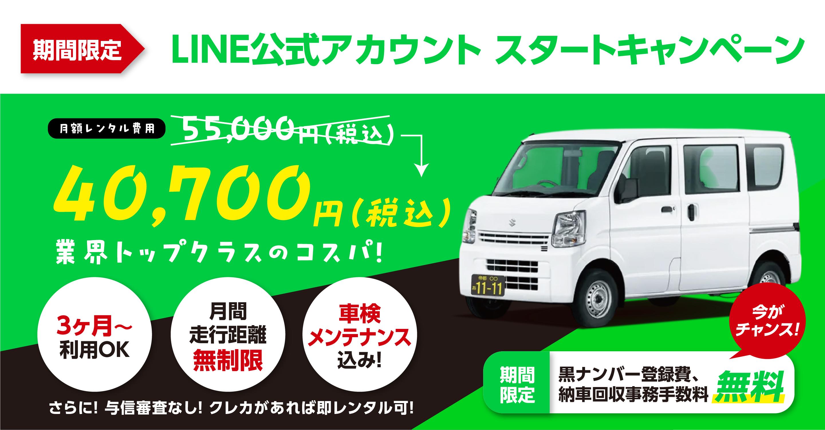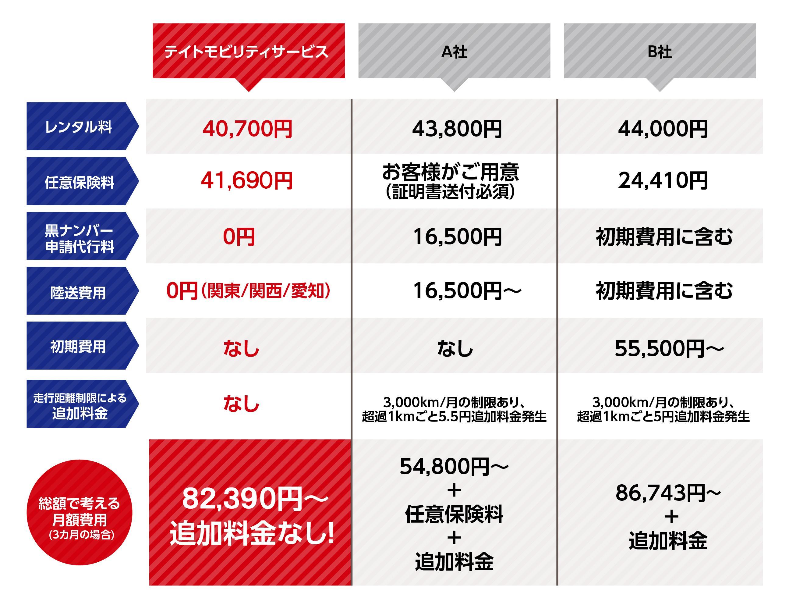 月額82,390円~ (2WDのレンタル料金と任意保険料の合計金額) レンタル料:月額40,700円(税込) -車両代、メンテナンス費用などの車両維持費、自賠責保険の保険料込み 任意保険料:月額41,690円~ -対人・対物無制限、車両保険のプラン ※陸送費用:関東、関西以外は陸送費用16,500円(税込)がかかります。(初回のみ) ※4WD(宮城のみ)は、レンタル料:月額46,200円(税込) |